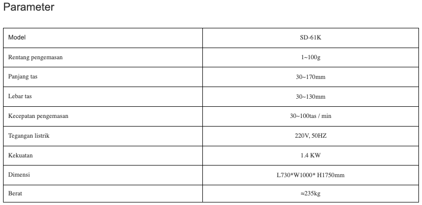 - > Bahan kemasan: polipropilen/polietilen, aluminium foil/polietilen, poliester/aluminat/polietilen, nilon / polietilen yang diperkuat, kertas/polietilen, dll;